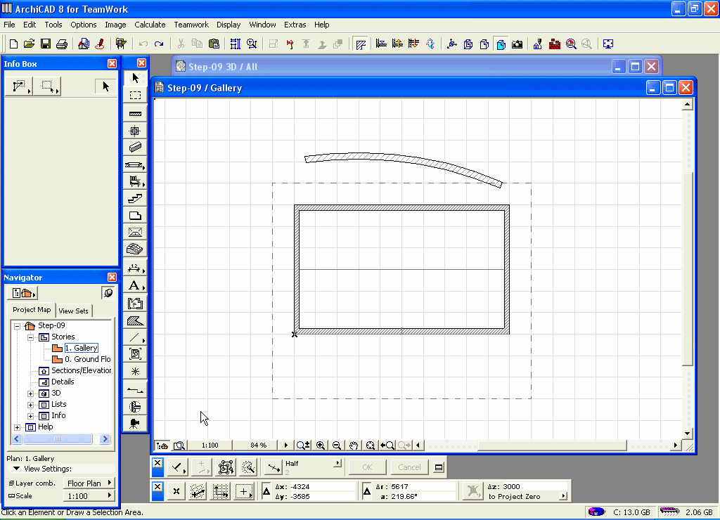 Nakon postavljanja preseka, otvorite prozor preseka (Window/Sections/Elevations/A/1 Section (Model) ), i ArchiCAD će automatski generisati presek kroz model.