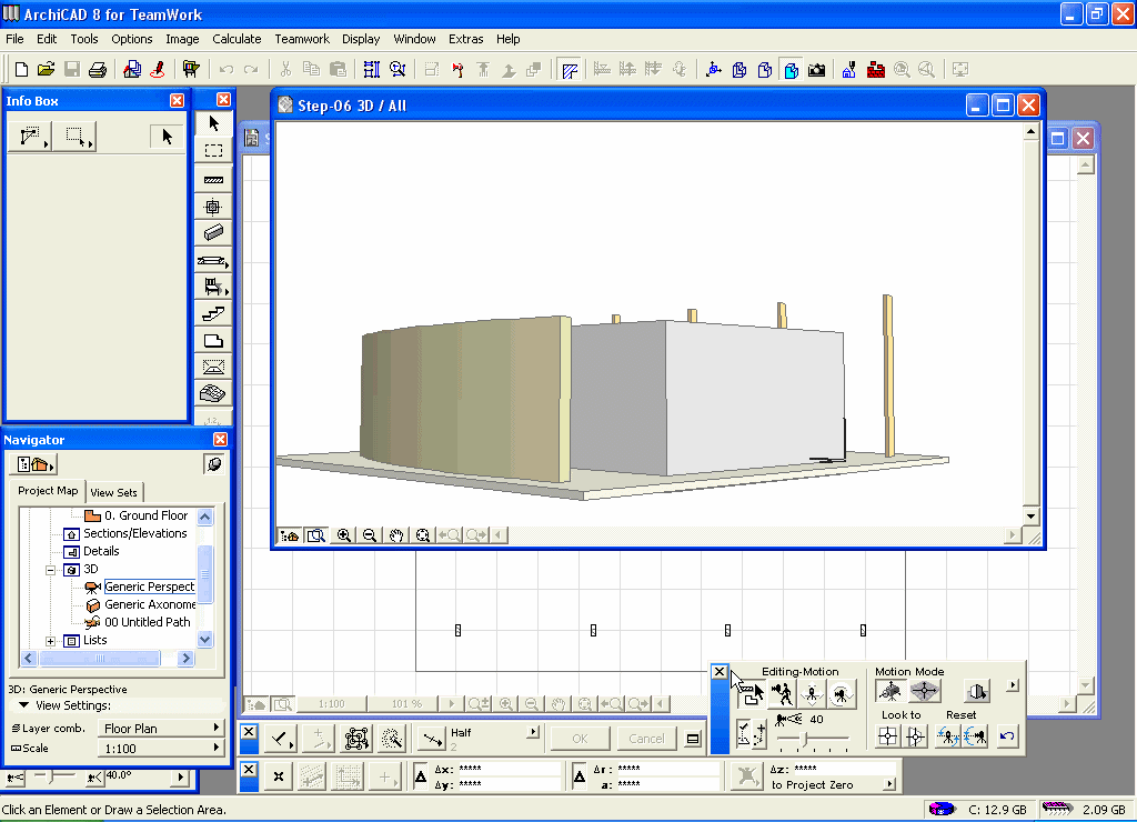 Postavite kursor na 3D prozor tako da strelica kursora bude usmerena nagore i prevucite miš polako ka gore da napravite korak unaprijed; povucite miš nadole kako biste koraknuli unazad, a lijevo ili desno da napravite korak u stranu.