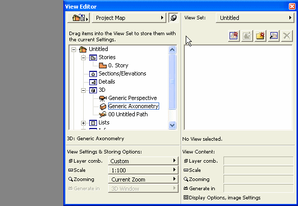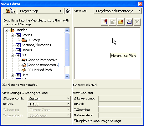 Kada smo definisali lejere i kombinacije lejera, povezaćemo ih sa definisanim pogledima. Uz pomoć Viwe Editora, dodelićemo razmeru, opcije displeja, kombinacije lejera i pogled. Da bismo editovali Viwe Set (podešavanje pogleda), kliknućemo na dugme u gornjem levom uglu dijaloga i selektovati srednje dugme kako bismo aktivirali Viwe Editor.