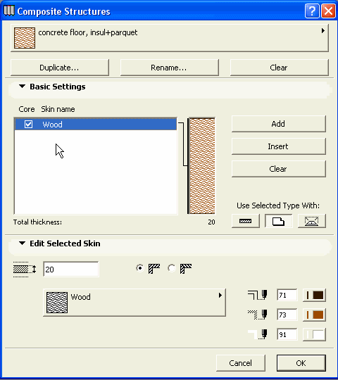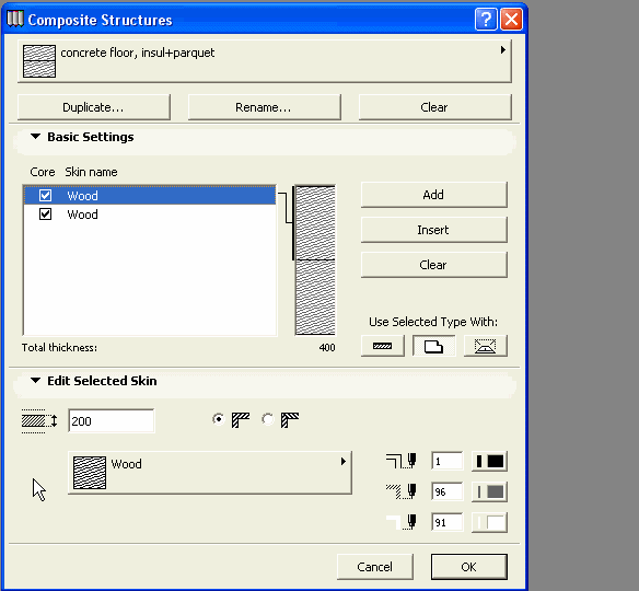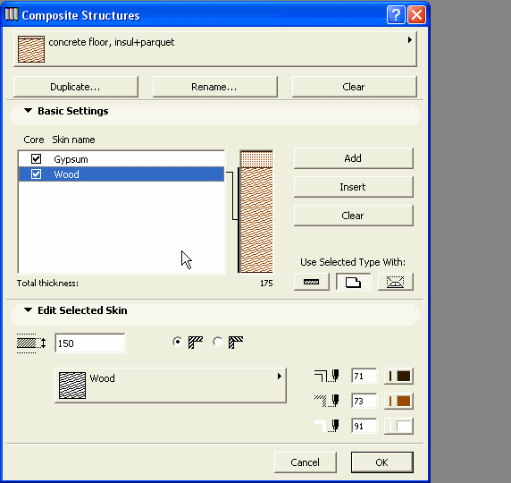 Selektujte spoljnu ovojnicu zida, a zatim kliknite na opcije za šrafure u delu dijaloga "Edit Selected Skin" i odaberite šrafuru Gypsum (gips). Da promenite širinu gipsanog dela kliknite na kućicu za veličinu i upišite 25 mm.