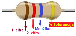 | COLOR | Boja prvog prstena cifra | Vrijednost prve cifre | Boja drugog prstena cifra | Vrijednost druge cifre | Množilac Boja trećeg prstena |