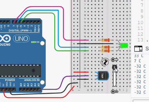 // Termometar senzor i RGB dioda sa opsezima temperature
