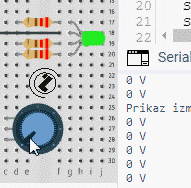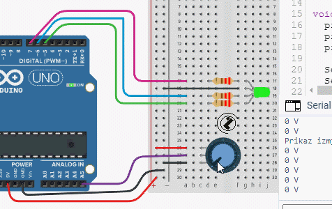 27.1.. Voltmetar - RGB dioda sa opsezima napona - if else naredba. Vrijednosti napona na potenciometru se očitvajau na analognom ulazu.