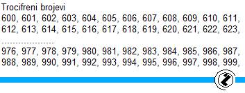 Opis rješenja: Zadatak je riješen korištenjem tri FOR petlje, petlja u petlji. Vanjska petlja je za ispis cifre stotica, a unutrašnja za ispis cifre desetica i jedinica. Cifre stotica počinju od 6 do 9, a ostale od 0 do 9.