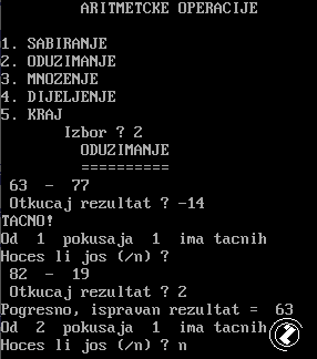 26.6.. Aritmetičke operacije - dva broja. Korisnik bira aritmetičku operaciju. Na osnovu slučajno generisana dva broja treba otkucati odgovor. Programom je obezbjeđena provjera ispravnosti otkucanog rezultata.