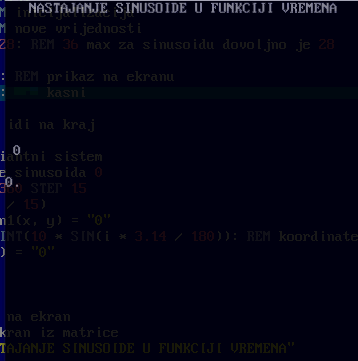 Opis rješenja: Poslije deklarisanja varijable u matrici se postavljaju vrijednosti koordinatnog sitema (REM koordinatni sistem). Zatima se izračunavaju vrijednosti tri sinusoide i smješta u matricu sin1 (REM koordinate sinusoida ...). Prikaz izračunatih vrijednosti sinusuoida tj. vrijednosti iz matrice se izvodio na kraju (REM ipis na ekran iz matrice). Ispis matrice po x-osi je ograničen sa varijablom t. Ovim se postiže dinamika tj. kako nastaje sinusoida.
