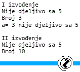 Opis programa: Naredbom IF se izvodi provjera nije djeljivo sa 5, logički izraz je (x % 5 != 0). Provjera da li je ostatak cjelobrojnog dijeljanje (%) različit od nule. Ako nije djeljiv sa 5 ispisuje se tekst NIJE DJELJIV.