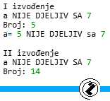 Opis programa: Naredbom IF se izvodi provjera nije djeljivo sa 7, logički izraz je (x % 7 != 0). Provjera da li je ostatak cjelobrojnog dijeljanje (%) različit od nule. Ako nije djeljiv sa 7 ispisuje se tekst NIJE DJELJIV.