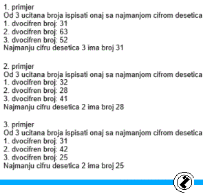 cout << "Od 3 ucitana broja ispisati onaj sa najmanjom cifrom desetica" << endl; // naslov