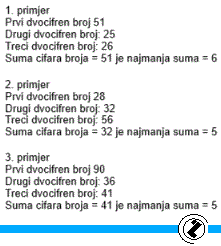 7.2.. Učitati 3 dvocifrena broja i ispisati onaj broj čija je suma cifra najmanja.