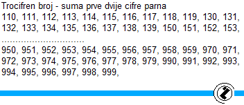 cout << "Trocifren broj - suma prve dvije cifre parna" << endl; // naslov