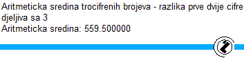 cout << "Aritmeticka sredina trocifrenih brojeva - razlika prve dvije cifre djeljiva sa 3" << endl; // naslov