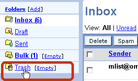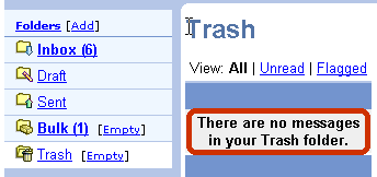 Postupak: 0. INBOX 1. Postaviti pokazivač iznad CHECKBOX -a neželjene poruke 2. Click na CHECKBOX kolone DELETE 3. Click na dugme DELETE 4. Poruka je nestala iz liste INBOX 5. Click na TRASH (lijevo) 6. Otvara se TRASH 7. Postaviti pokazivač iznad CHECKBOX -a neželjene poruke u koloni DELETE 8. CHECKBOX postaje aktivan 9. Click na dugme DELETE 10. Hoćete li sve da obrišete? (YES) 11. TRASH je prazan *NO MESSAGES* |
