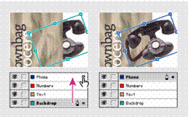 Za prebacivanje objekata postoje dva načina: kopiranje i prebacivanje. Kopiranje se vrši standardnim windows komandama copy-paste. Prebacivanje se vrši tako što kad označimo sve objekte u desnom dijelu layera pojavi se mala kockica. Kliknemo na tu kockicu i prevučemo je na drugi layer prilikom čega se izvršilo pomjeranje objekata. |