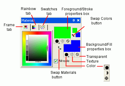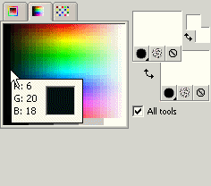 Frame tab i Rainbow tab su veoma slične opcije.I jedna i druga služe za odabir osnovnih boja samo imaju drugačiji izbor.Boje birate klikom, desnim za boje u prvom planu(), lijevim za pozadinske (Background) boje.Koju ste boju selektovali ooslikava vam se u Foreground box ili u Background box. Pod opcijom Swatches tab možete da sačuvate neke boje koje treba da koristite ponovo. |