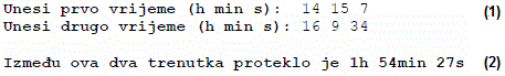 24.2.3.24010130. Napisati program koji traži da sa tastature unesemo podatke o dva vremenska trenutka, u satima, minutama i sekundama, a koji računa i ispisuje vrijeme koje je proteklo između ta dva vremenska trenutka, također u satima, minutama i sekundama. Pretpostaviti da je drugi vremenski trenutak uvijek nakon prvog.