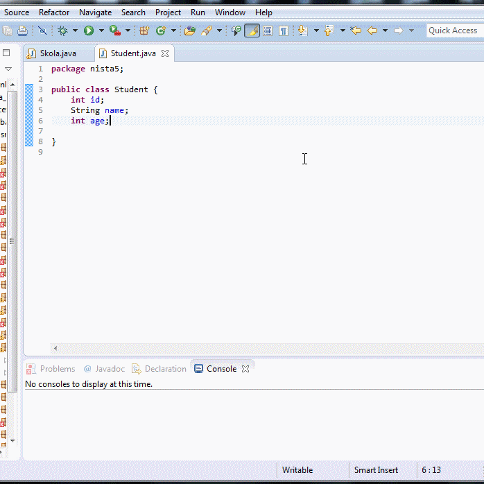 Eclipse omogućuje automatizaciju postupka dodavanja GET i SET metoda. Sa GET i SET metodama omogućujemo zaštitu podataka od neželjenog pristupa korisnika /ENCAPSULATION/