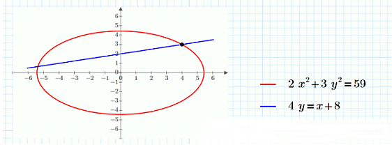 1. Prvo treba odrediti koje krive predstavljaju date funkcije(očigledno je da je kriva 2x^2+3y^2=59 elipsa, a 4y=x+8 linija).