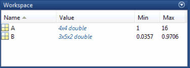 Radni prostor (workspace) sadrži varijable koje kreiramo u Matlabu ili ih u njega uvozimo iz fajlova sa podacima ili drugih programa. Na primjer, ove naredbe kreiraju varijable A i B u radnom prostoru.