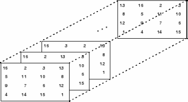 sprema sekvencu od 24 magična kvadrata u trodimenzionalni niz, M. Veličina M je
