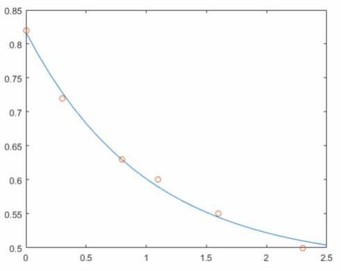 Prethodna jednačina kaže da vektor y treba biti aproksimiran linearnom kombinacijom dva druga vektora. Jedan je konstantni vektor koji sadrži sve jedinice, a drugi je vektor sa komponentama exp(-t). Nepoznati koeficijenti, i , mogu se izračunati pomoću fitovanja najmanjih kvadrata, što minimizira sumu kvadrata devijacija podataka iz modela. Postoji šest jednačina sa dve nepoznate, predstavljenih sa 6-sa-2 matricom.