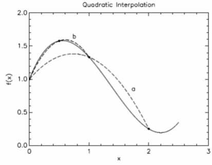 Razmotrimo Sliku 2. Ona pokazuje dva kvadratna fitovanja zakrivljene funkcije. Ono koje je označeno sa „a“ koristi samo tačke x= 0, 1, 2 i nije naročito tačno pošto su te tačke suviše međusobno udaljene. Ali aproksimacija koja koristi x = 0,0.5, 1, označena sa „b“, je zaista veoma dobra, mnogo bolja nego dvo-segmentno linearno fitovanje koje koristi iste tri tačke.