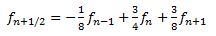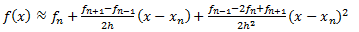 Upotrijebićemo ovu aproksimaciju (ignorišući sve članove poslije kvadratnog člana za (x−a)) u blizini tačke (xn,fn) u nizu jednako razmaknutih vrijednosti x. Razmak na x označimo sa h.