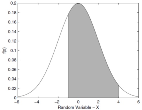 Površina ispod krive f(x) između -1 i 4 ima istu vrijednost kao vjerovatnoća da će posmatrana slučajna varijabla uzeti vrijednost u naznačenom intervalu.
