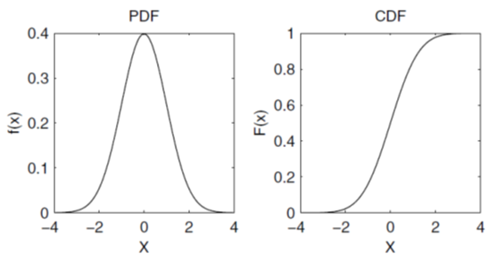 Ovdje je prikazana funkcija gustine vjerovatnoće na lijevoj strani sa pridruženom funkcijom kumulativne raspodjele na desnoj strani. Primijetimo da funkcija kumulativne raspodjele uzima vrijednosti između 0 i 1.