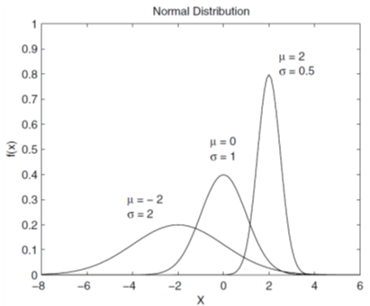 Slika 3. Primjeri funkcija gustine vjerovatnoće za normalno distribuirane slučajne varijable. Primijetimo da kako varijansa raste, visina funkcije gustine vjerovatnoće pri srednjoj vrijednosti opada.