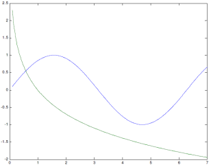 (Plava kriva je graf funkcije f(x), a zelena funkcije g(x).) Odmah uočavamo da se tražena nula nalazi u segmentu [0.1, 1], pa ćemo uzeti a = 0.1, b = 1. Izračunajmo sada najmanji broj polovljenja potrebnih za postizanje tačnosti ε = 0.0001. Koristimo nejednakost
