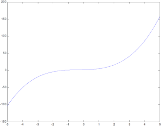 Uočavamo da je zadani polinom strogo rastući, a kako mora imati barem jednu realnu nulu (jer je neparnog stepena), slijedi da ima tačno jednu realnu nulu. Budući da sa slike ne možemo baš precizno odrediti u kojem se segmentu ''užem'' od segmenta [–5, 5] nalazi ta nula, uzećemo a = –5, b = 5. Izračunajmo najmanji broj polovljenja potrebnih da bi se postigla željena tačnost. Zatvorimo dobijenu sliku, vratimo se u radni prostor i u njegov novi red ukucajmo: