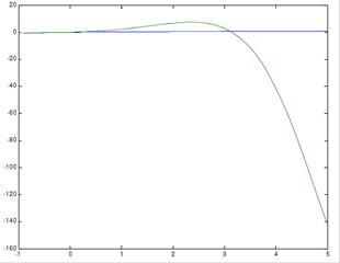 Ovdje nam zadani interval služi jedino kao putokaz na kojem segmentu trebamo crtati grafove tih funkcija. Naime, ukoliko se umjesto početne aproksimacije kao ulazna varijabla funkcije fzero navede segment, fzero će pretpostaviti da se u tom segmentu nalazi najviše jedna nula posmatrane funkcije, što uopšte ne mora biti tačno. Zato moramo najprije nacrtati grafove zadanih funkcija na zadanom segmentu, a potom pomoću dobijenog grafa odrediti sve eventualne početne aproksimacije nula. U novom redu radnog prostora ukucajmo:
