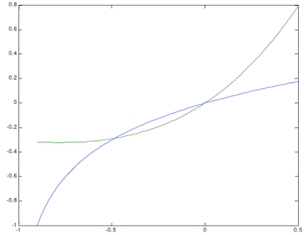 Dakle, postoje ukupno 3 zajedničke tačke posmatranih funkcija. Jedna se nalazi ''blizu'' –0.5, druga ''blizu'' 0, a treća blizu 3. Za njihovo tačno određivanje koristićemo funkciju fzero. Budući da ta funkcija ne rješava jednačine tipa f(x) = g(x), već samo jednačine tipa f(x) = 0, napišimo jednakost f(x) = g(x) u obliku