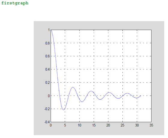 Analizirajmo sadržaj ovog fajla. Prva linija počinje sa znakom procenta %. To je komentar. Svi komentari se ignorišu od MATLAB-a. Oni se dodaju da poboljšaju čitljivost koda. U sljedeće dve linije kreiraju se nizovi x i y. Primijetimo da tačka-zarez završava obe komande. Ovo sprečava prikazivanje sadržaja oba vektora na ekranu. Niz x sadrži 1000 jednako razmaknutih brojeva u intervalu [π/100 10π] dok niz y sadrži vrijednosti sinc funkcije y = sin(x)/x u tim tačkama. Primijetimo da je upotrijebljen tzv. dot operator . prije operatora desnog dijeljenja/. Ovo govori MATLAB-u da izvede komponentsko dijeljenje dva niza sin(x) i x. Komanda plot kreira graf sinc funkcije pomoću tačaka generisanih u dve prethodne linije. Konačno, izvršava se komanda grid. Ovo dodaje rešetku grafu. Ovaj fajl pozivamo kucajući njegovo ime u Command Window i zatim pritisnemo Enter/Return