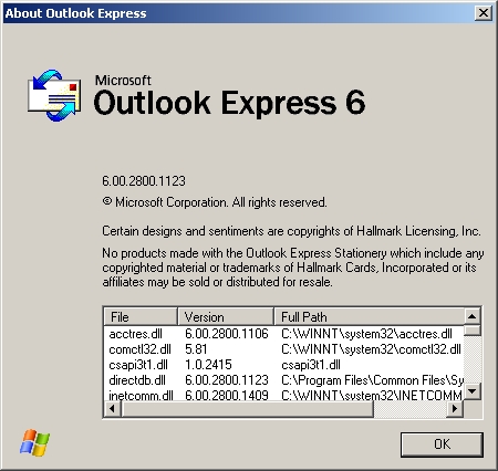 Dobićete ovakav ekran gde su ispisani osnovni podaci o vašoj verziji Outlook Express-a
