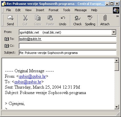 Vaš odgovor možete napisati ispred teksta pisma na koje odgovarate, a taj tekst možete ako hoćete i obrisati. Ponekad pomaže da se taj tekst ostavi jer je pošaljiocu lakše da se podsjeti šta vam je napisao. Dalja procedura je ista kao kod slanja običnog pisma: kliknete na Send ili ako nećete da ga šaljete odmah, na File pa Send Later.