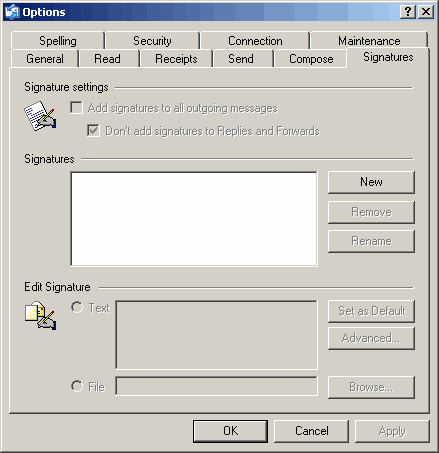 Otvoriće se prozor Options u kome rebate kliknuti na karticu Signatures
