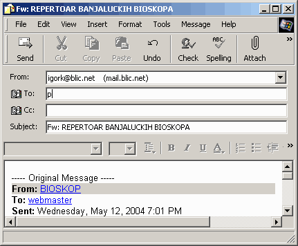 Dobijeno pismo (npr. reklamu za novi sajt) želite da proslijedite svom prijatelju kojeg bi taj sajt mogao zanimati. Tada ćete postupiti ovako: kliknite na dugme Forward