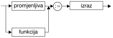 Promjenljiva, funkcija i izraz moraju pripadati istom tipu. Dozvoljen je izuzetak kad je izraz cjelobrojnog tipa, promjenljiva ili funkcija realnog tipa. Razultat se preračunava iz cjelobrojnog u realan tip. Tabela 6.8. Pridruživanje