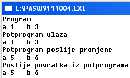 Opis programa: Varijablama a i b se u potprogramu pridružuju nove vrijednsti a:=5; b:= 6; i one ostaju i izvan potprogram to se vidi po ispisu.