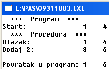 Opis programa: Varijable x i y u glavnom programu dobijaju vrijednosti 1 4. Prenošenje ovih vrijednosti u potprogram se izvodi direktno, jer je to definisano u zaglavlju potprograma sa definisanjem varijabli a i b PROCEDURE Dodaj_2 (a:Integer; VAR b:Integer). U procedure se uvaćavaju vrijednosti varibli a i b i kao uvačane se ispisuju. Pri izlasku se dešava da x ima staru vrijednost a y novu. Zato što je x definsano samo kao ulazna varijabla (a:Integer; ) a y je sa naredbom VAR definisana kao ulazno izlazna tj. pri izlasku iz programa varijabli y će se pridružiti nova vrijednost.