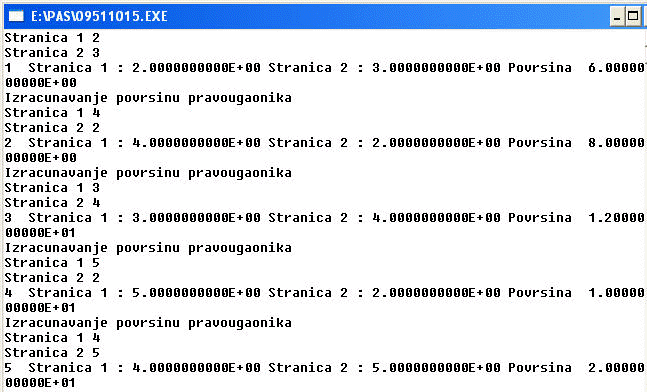 Writeln (i,' Stranica 1 :', a, ' Stranica 2 :', b, ' Povrsina ', p);