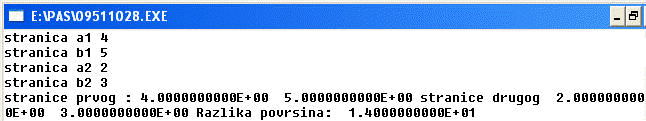 Writeln ('stranice prvog :',a1,' ',b1,' stranice drugog ',a2,' ', b2,' Razlika povrsina: ',razlika);