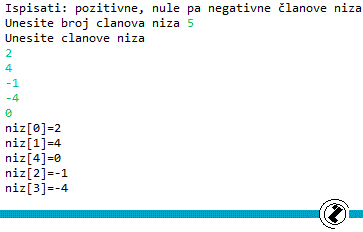 Učitati članove niza. Ispisati: pozitivne, nule pa negativne članove niza.
