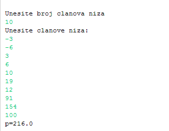10.1.. Učitati članove niza. Izračunati i ispisati proizvod pozitivnih članova niza koji su djeljivi sa 3.