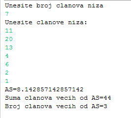 Opis programa: Izdvajanje se izvodi samo kad je vrijednost člana niza veća od aritmetičke sredine (X[i] > as).