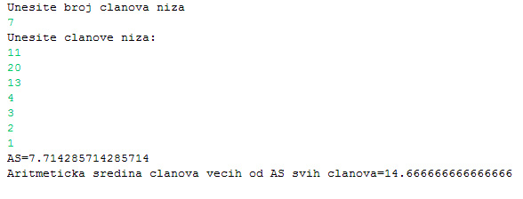 Opis programa: Izdvajanje se izvodi samo kad je vrijednost člana niza veća od aritmetičke sredine (X[i] < as).
