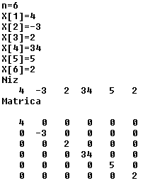 109.2.. Sa tastature se unosi niz x[n]. Formirati niz A[n,n] kod kojeg su elementi na glavnoj dijagonali x[i] ,a ostali su nula: