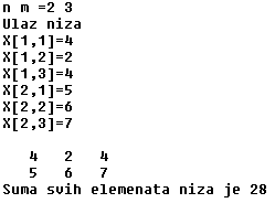 109.3.. Učitiat dvodimenzionalni niz - matricu nxm. Izračunati i ispisati sumu svih elemenata niza A[5,5].